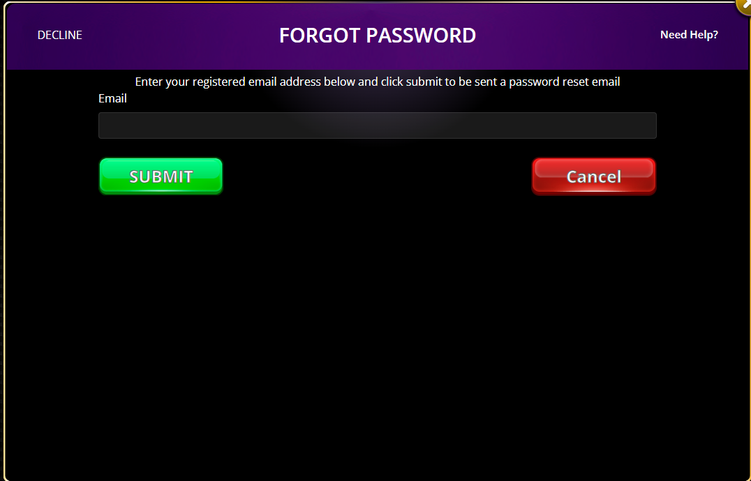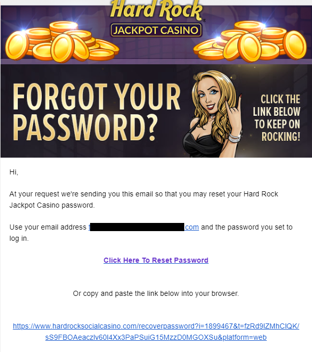After entering your email address and pressing "SUBMIT" you will be redirected to the login page again, and an email should be sent to you. If you do not receive an email please reach out to our support team directly at support@hardrockjackpotcasino.com.